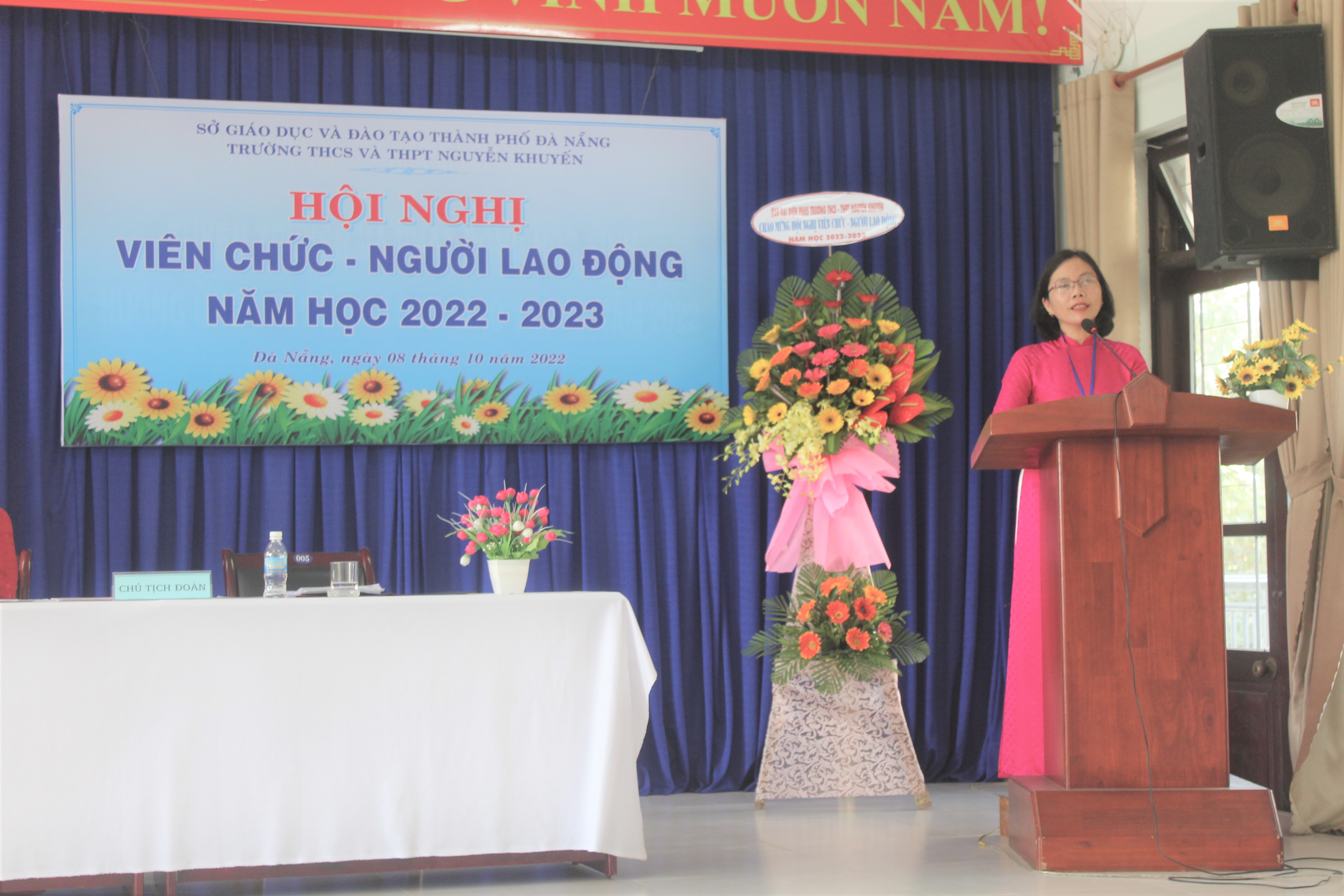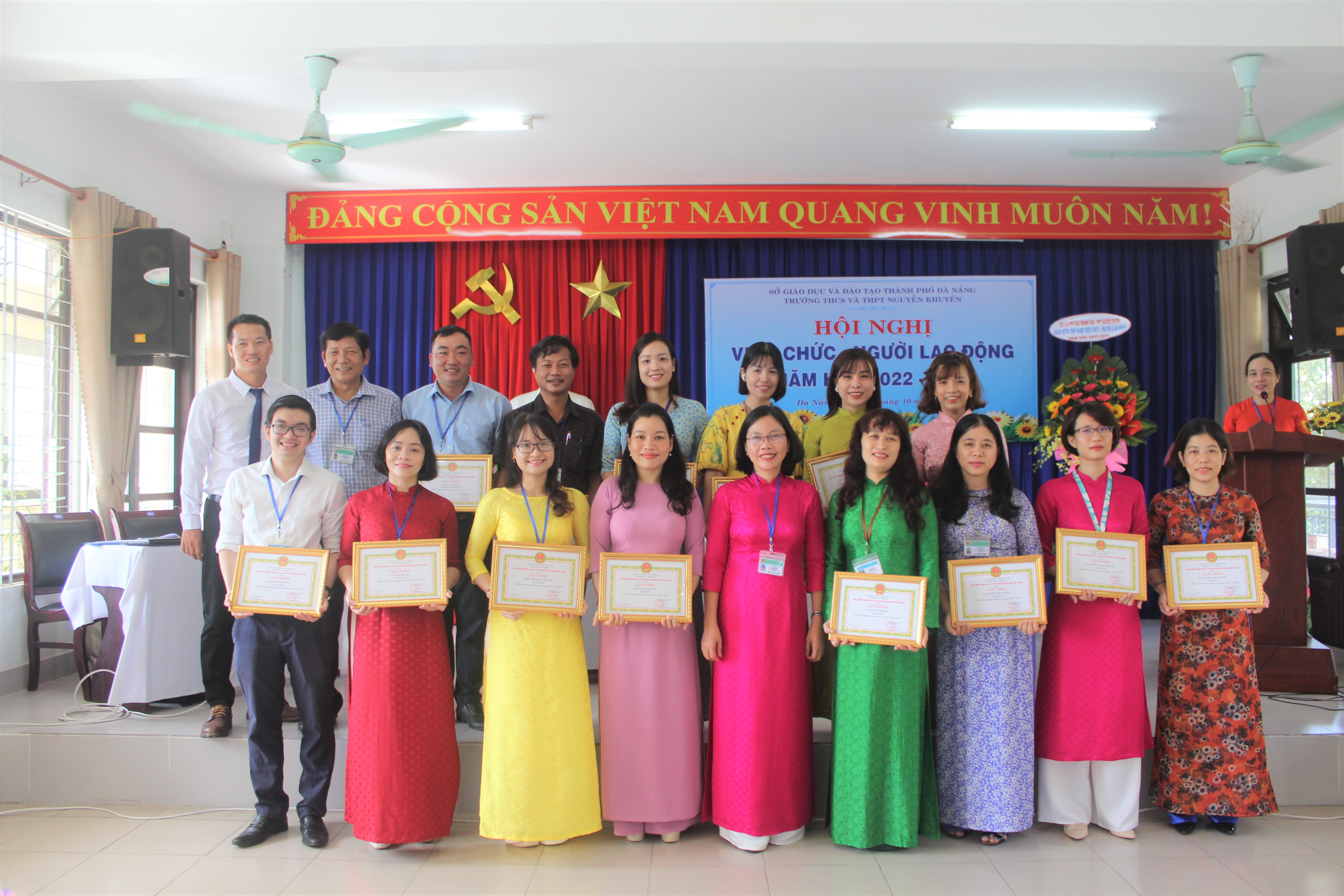 Hôm nay, ngày 08 tháng 10 năm 2022, Trường THCS & THPT Nguyễn Khuyến tổ chức Hội nghị Viên chức-Người lao động năm học 2022-2023. Về dự với Hội nghị có Ông Võ Thái Dương, Chuyên viên Phòng GDTrH, Sở GD và Đào tạo Đà Nẵng cùng toàn thể giáo viên, nhân viên nhà trường cũng có mặt đông đủ. Sau một buổi sáng làm việc khẩn trương, nghiêm túc; Hội nghị đã đánh giá công tác dạy – học năm học 2021-2022, đồng thời đề ra các nhiệm vụ, giải pháp và chỉ tiêu năm học 2022-2023.