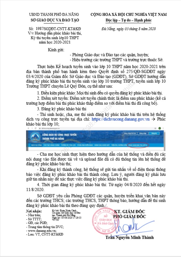 Hướng dẫn phúc khảo bài thi, Kỳ thi tuyển sinh lớp10 THPT năm học 2020-2021