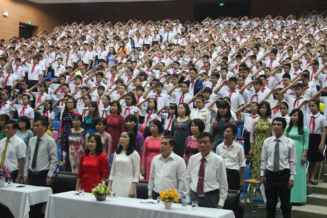 Sau phần văn nghệ chào mừng, toàn trường đứng dậy làm lễ chào cờ. Học sinh các lớp đứng trang nghiêm. Rồi bài hát Quốc ca và Đội ca lần lượt được vang lên hào hùng.