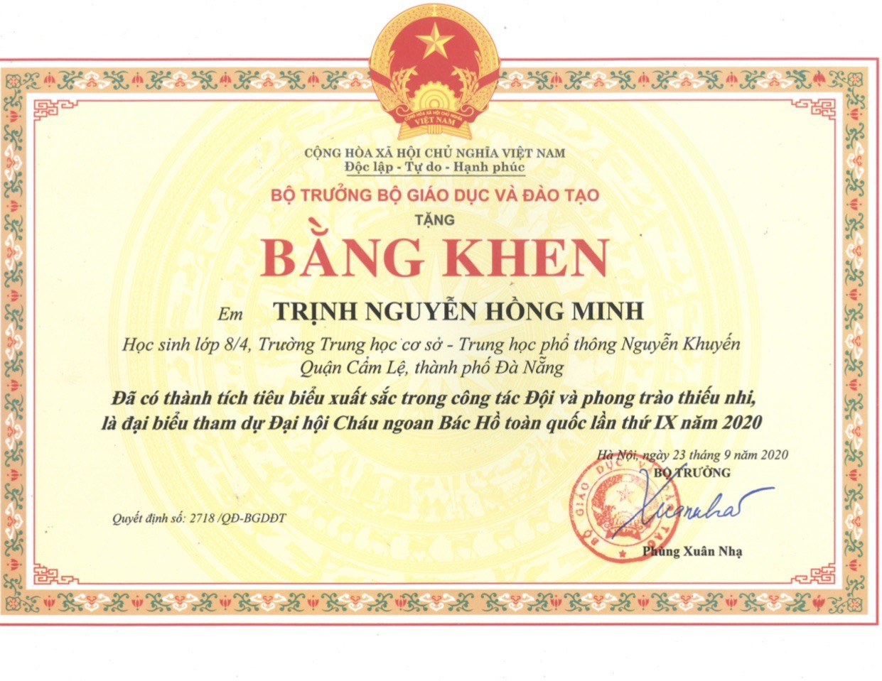 Nhằm ghi nhận những đóng góp liên tục và xuất sắc của em Trịnh Nguyễn Hồng Minh trong thời gian qua; Chủ tịch UBND TP Đà Nẵng đã công nhận Hồng Minh là Điển hình thi đua yêu nước thành phố năm 2020, Hồng Minh cũng là một trong số những đại biểu đại diện cho Thành phố tham dự Đại hội Thi đua yêu nước toàn quốc. Năm 2020 cũng là năm Em được tặng Bằng khen của Bộ trưởng Bộ Giáo dục và Đào tạo, bằng khen của Ban chấp hành Trung ương Đoàn TNCS Hồ Chí Minh khen tặng khi đạt danh hiệu “Đại biểu tiêu biểu Cháu ngoan Bác Hồ toàn quốc” và “Giải thưởng Kim Đồng toàn quốc”.