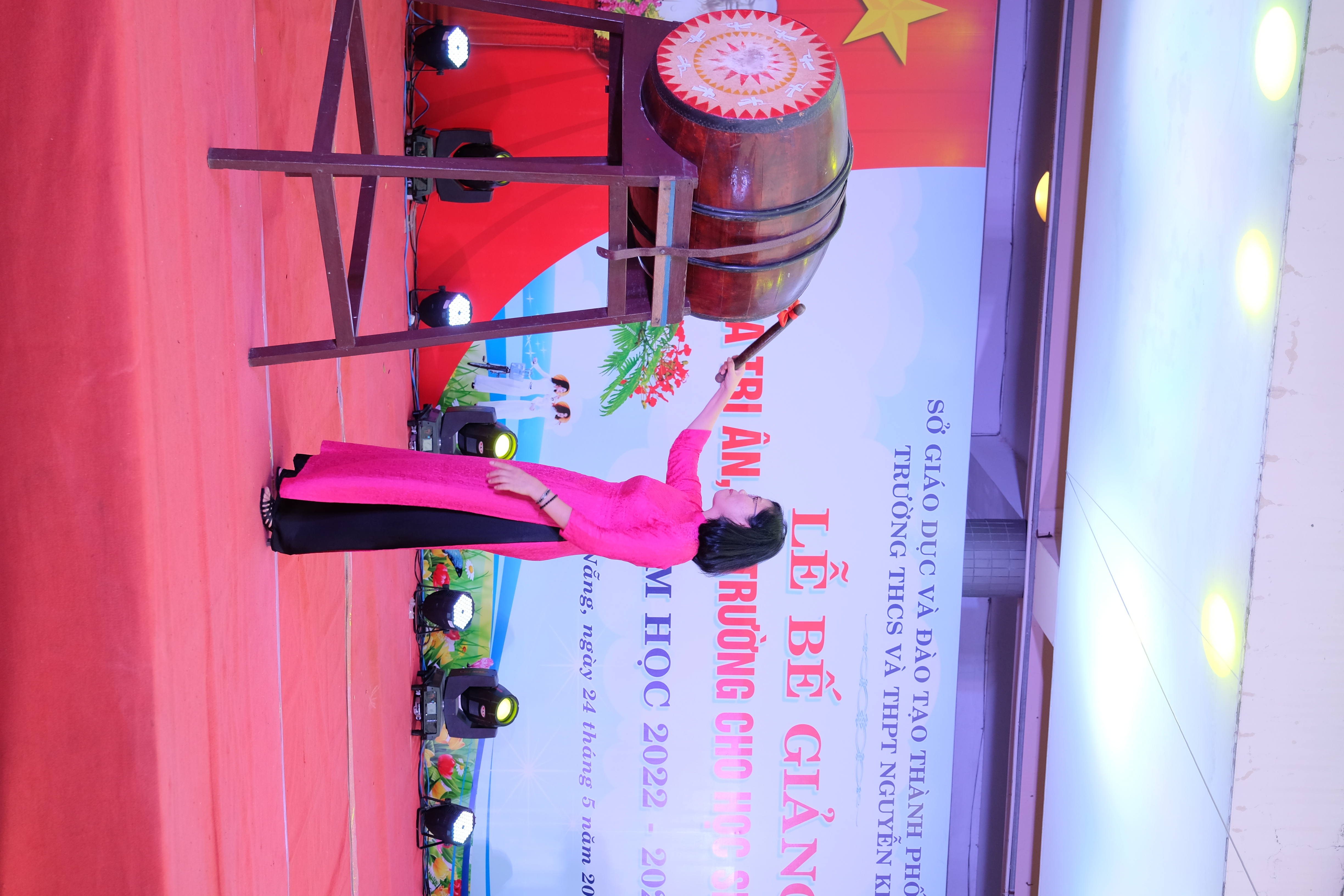 Cô Trần Thị Kim Vân – Bí thư Chi bộ – Hiệu trưởng nhà trường phát biểu tổng kết và đánh trống bế giảng năm học.